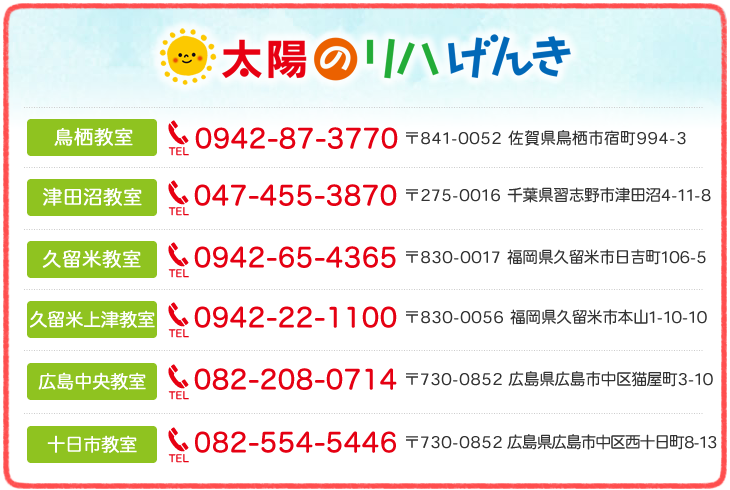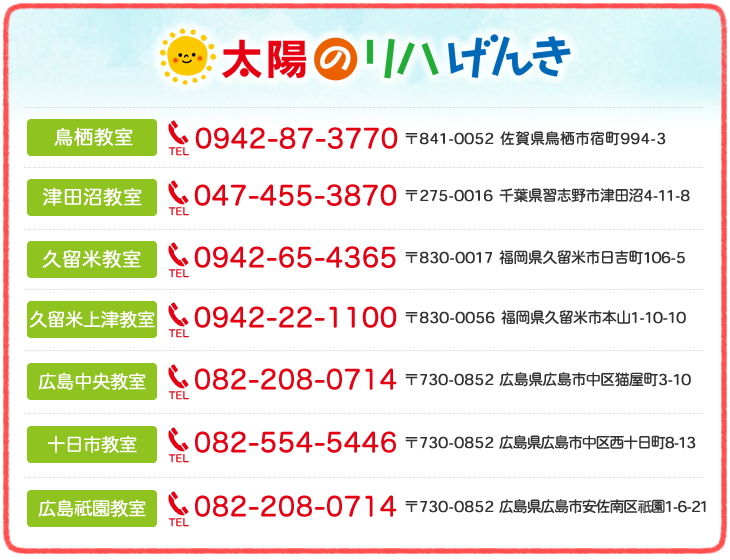 「太陽のリハげんき」は 「児童のできるを増やす!」をテーマに 理学療法士・作業療法士・保育士・児童指導員等の職員が 児童一人ひとりの成長・特性に合わた少人数での個別・小集団療育を行います。